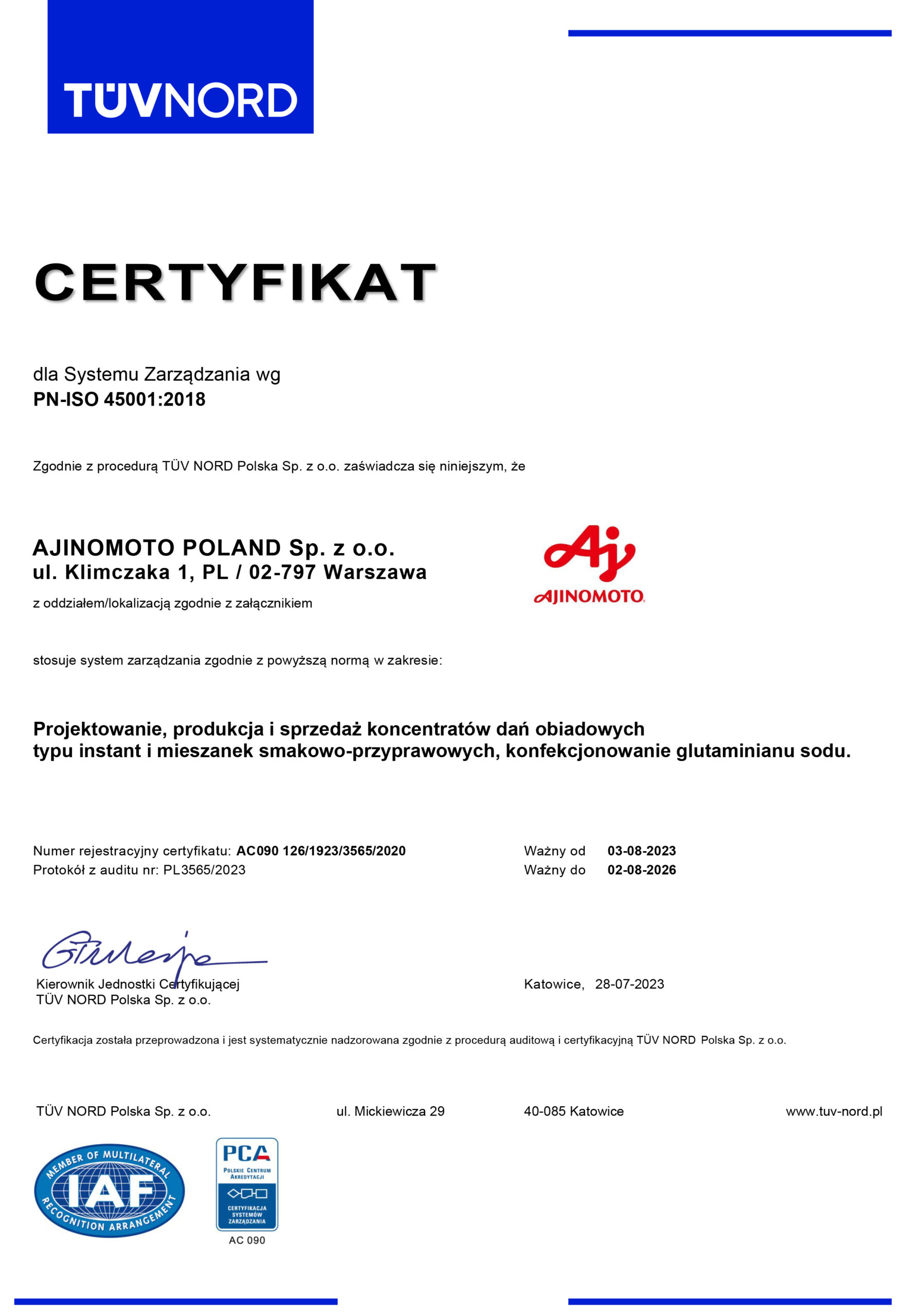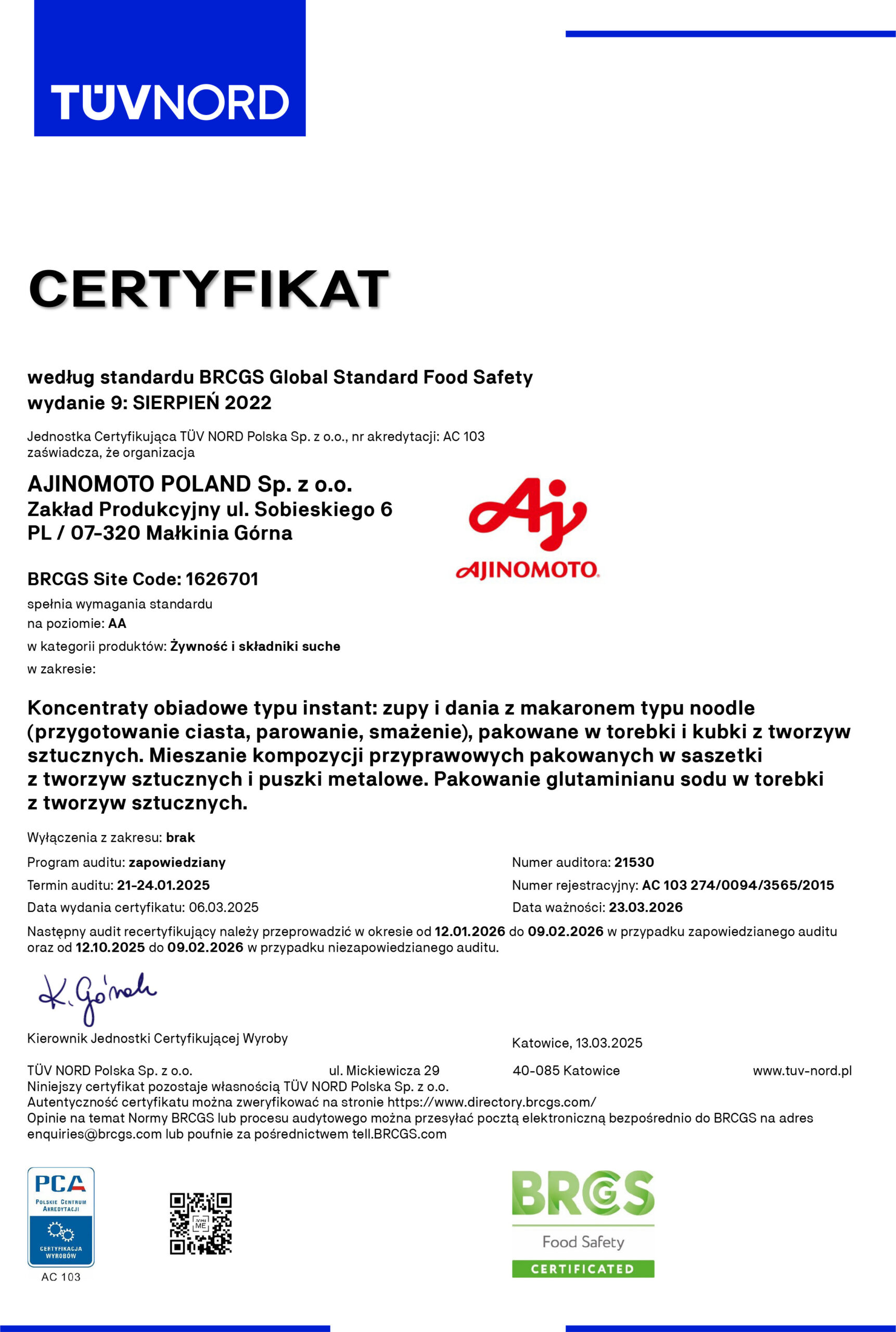 At Ajinomoto Poland Sp. z o.o., we aim to maintain the satisfaction and trust of our customers. This is why our priorities are focused on quality, product safety and caring about the environment, as confirmed by a number of certificates obtained and maintained according to international ISO norms and standards.